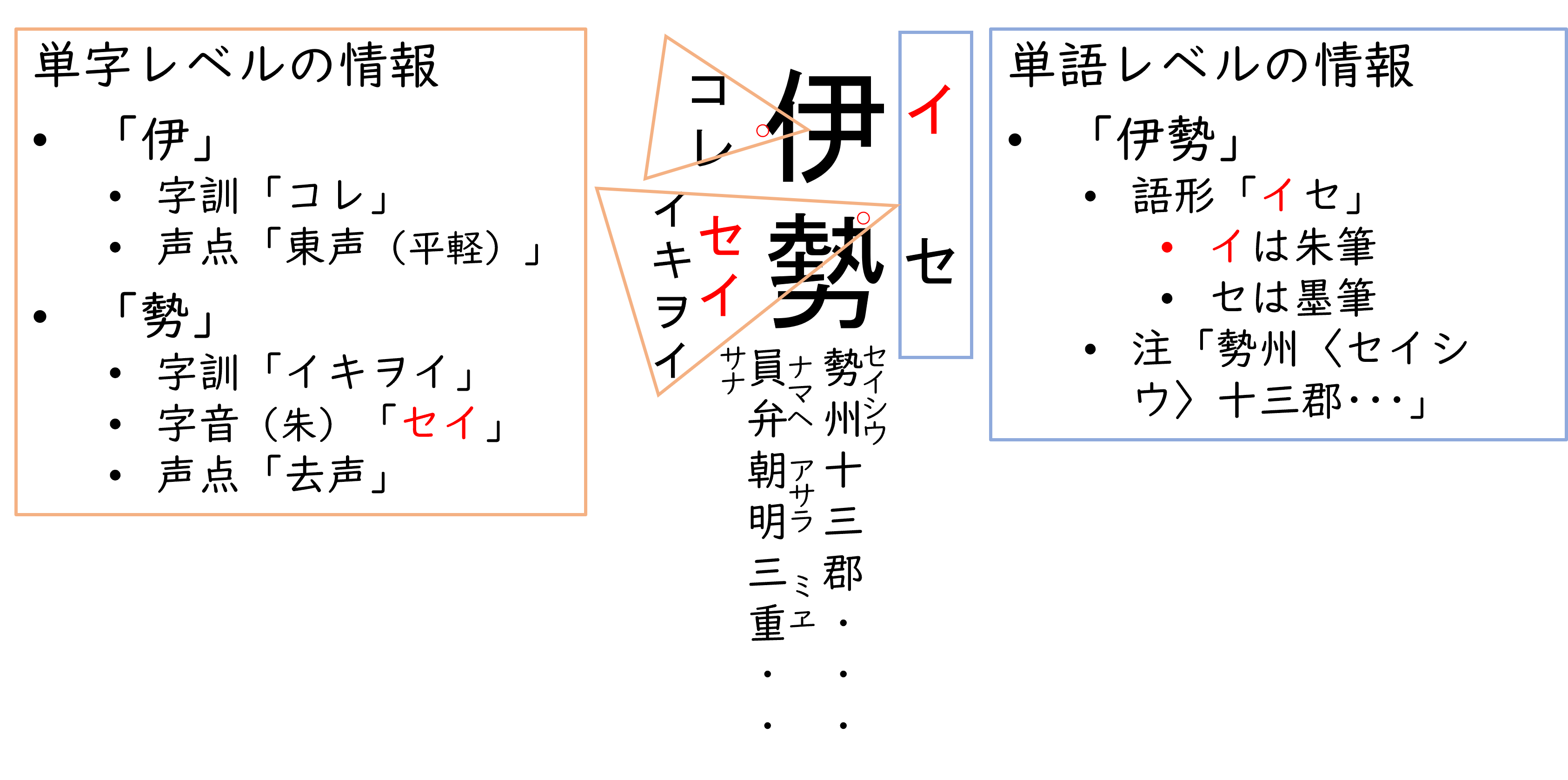 音訓(左傍)・声点については、見出し語の漢字数に応じて、読点「、」で区切って示しています。